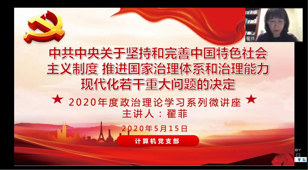 2020年5月15日,根据QY千亿球友会教职工政治理论学习要求及第二季度基层党组织“两学一做”学习教育安排,为保障疫情防控期间支部与教研室工作的正常进行,进一步提高教职工思想政治素质和理论水平,推进学校教育教学改革发展,计算机党支部和计算机教研室,立足本职、多措并举,充分利用线上多元化的方式,积极开展教职工政治理论云学习,为疫情防控时期,稳步推进教学科研工作提供强有力的思想保障和精神动力。会议由计算机党支部书记翟菲主持。郑小松、翟菲、张晓帆、宗东升四位党员员工分别以《习近平在全国教育大会上的讲话》、《中共中央关于坚持和完善中国特色社会主义制度 推进国家治理体系和治理能力现代化若干重大问题的决定》、《用新时代中国特色社会主义思想铸魂育人、贯彻党的教育方针落实立德树人根本任务》、《把思想政治工作贯穿教育教学全过程》为主题,为教研室全体员工讲授微党课。