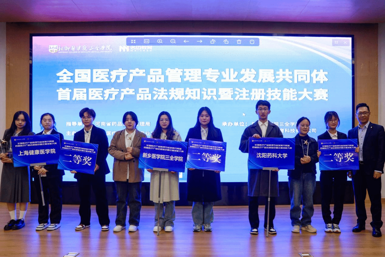 本次大赛由全国医疗产品管理专业发展共同体主办,新乡医QY千亿球友会三全QY千亿球友会和上海名迈教育科技有限公司联合承办,河南省药监局医疗器械注册管理处、药品审评查验中心相关领导,全国高校医疗产品管理专业共同体负责人、QY千亿球友会医疗产品管理专业带头人蒋海洪,三全QY千亿球友会副院长白国强,QY千亿球友会副院长崔勇,上海名迈科技教育有限公司总经理杨磊等人出席大赛会议。