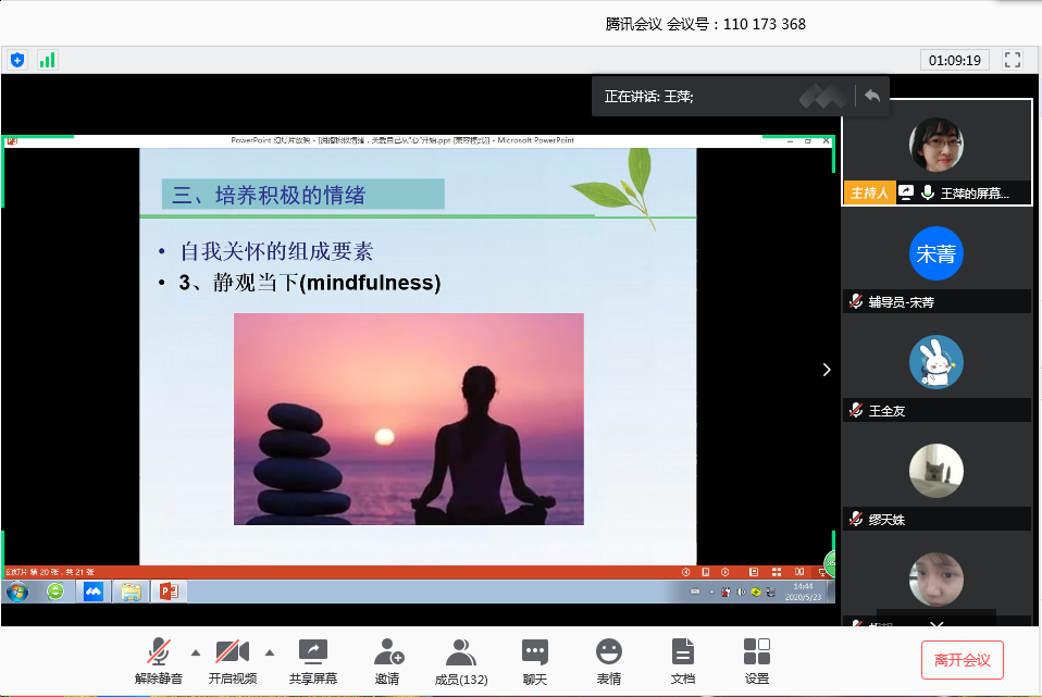 王萍以“拥抱积极情绪,关爱自己从“心”开始”为题,结合当前疫情时期员工居家学习的实际情况,深入浅出的向同学们讲解认识危机,疫情下应激反应及调试,以及如何培养积极的情绪。通过举例的方式为同学们详细讲解每一部分的内容,同学们学习到要懂得感恩、学会自我关怀,通过善待自己、共通人性,静观当下的方法科学地应对危机情绪,培养积极情绪。讲座最后王萍带着同学们做心理放松训练,跟随音乐和指令同学们身心得到放松,能够平和接纳自己的缺点及不足,纷纷表示受益匪浅。