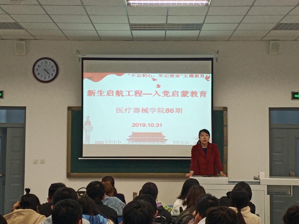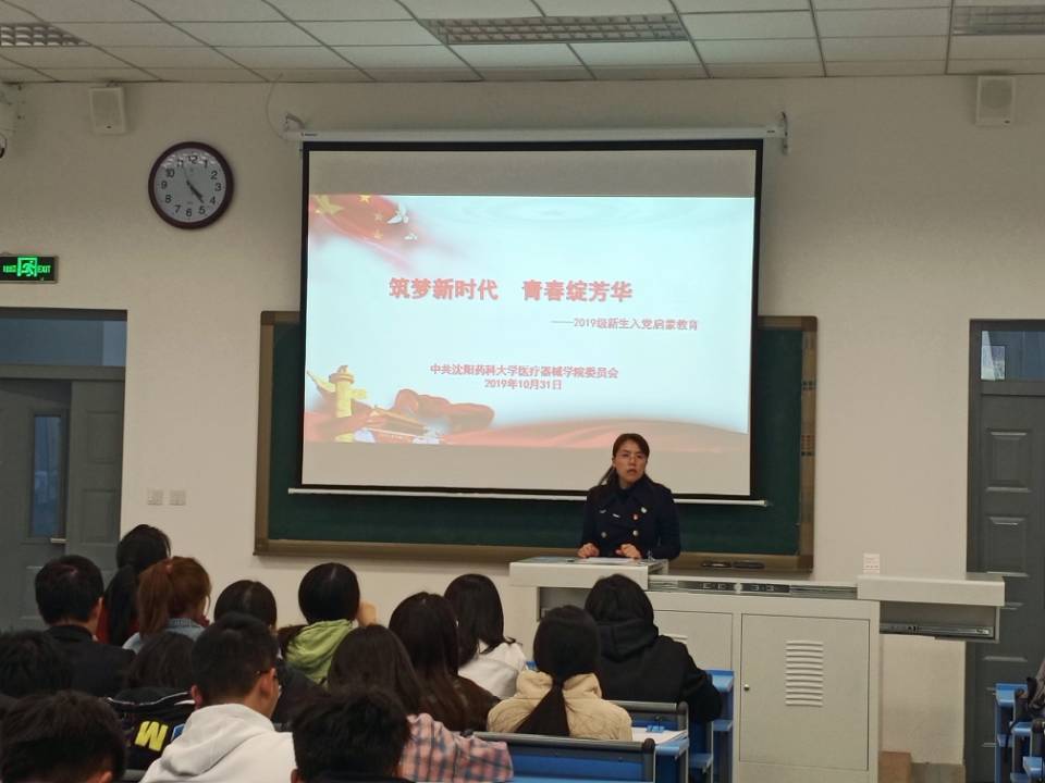 2019年10月31日,QY千亿球友会党委副书记赵宏格以“筑梦新时代,青春绽芳华”为题为全体新生做入党启蒙教育。辅导员宋菁主持活动。