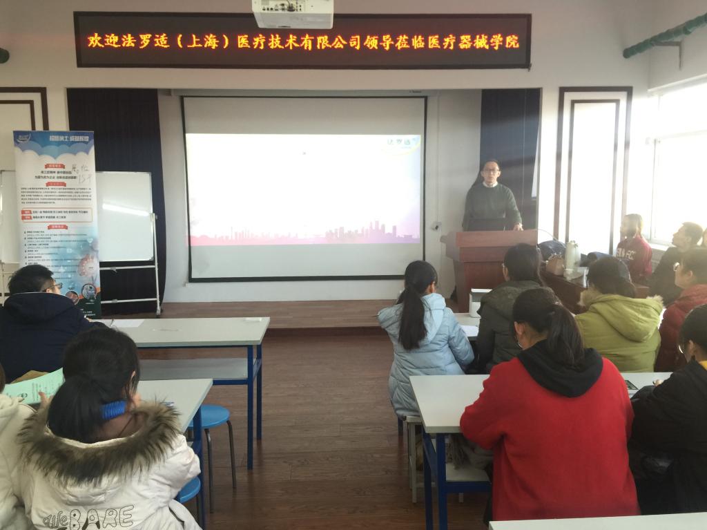 杨经理首先对到场的企业代表做了简短介绍,对公司名称——法罗适的来源做了解释。随后,给同学们概括讲解了公司的经营理念,国内分布,所创收益等。在讲到公司已经研发上市的医疗器械产品时,杨经理列举了“低频止吐仪”、“新生儿脐带部位消毒液”等公司目前最新的医疗产品。