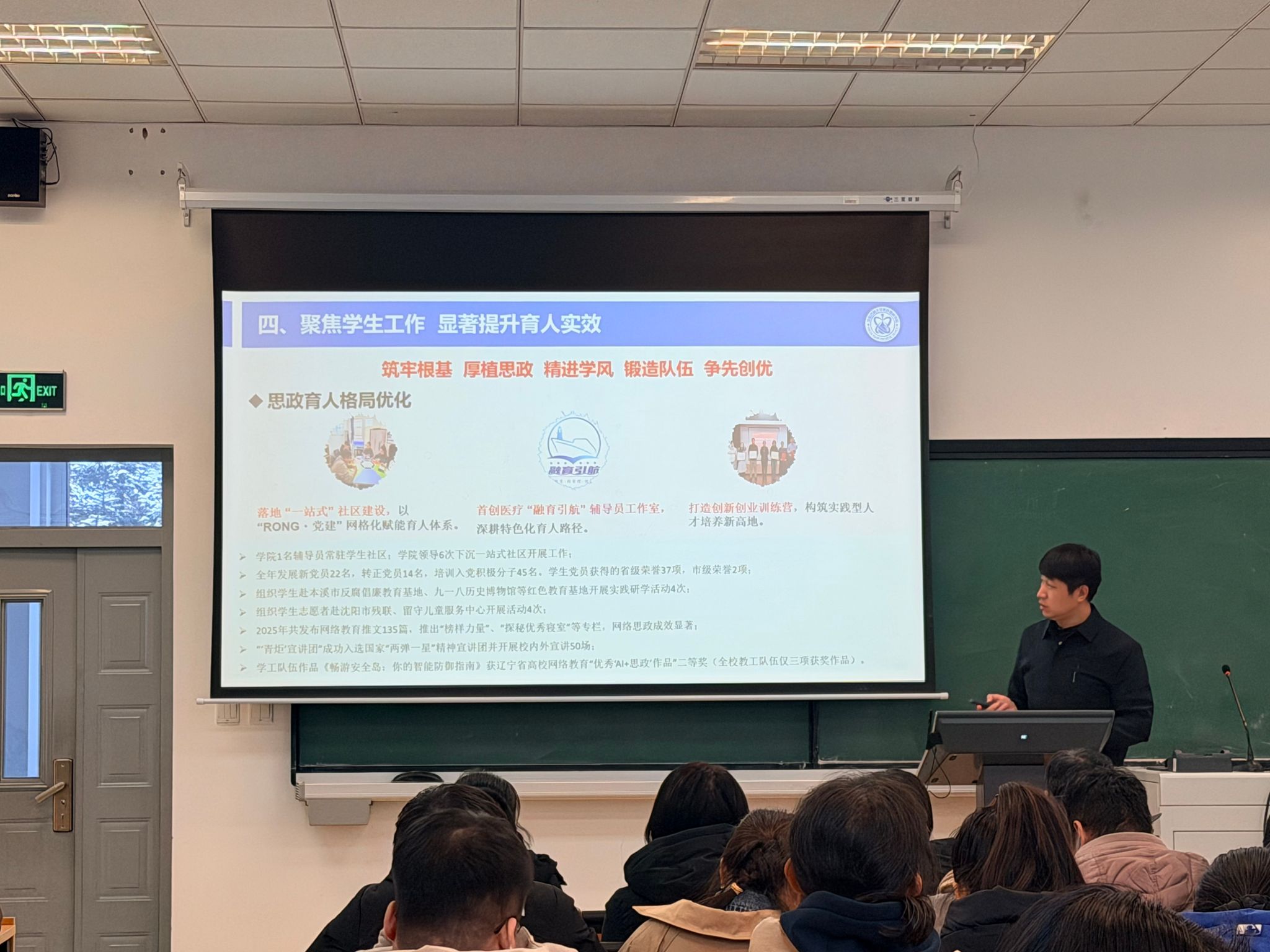 副院长(主持工作)崔勇代表QY千亿球友会领导班子作年度工作总结报告,明确指出2025年QY千亿球友会在校党委坚强领导下,全面贯彻党的二十大和二十届历次全会精神,深入落实辽宁全面振兴三年专项行动,紧扣学校“十四五”规划既定任务,全院师生团结拼搏、砥砺奋进,在党群建设、教育教学、人才培养、学科科研及社会服务等各项工作中均斩获阶段性成果。